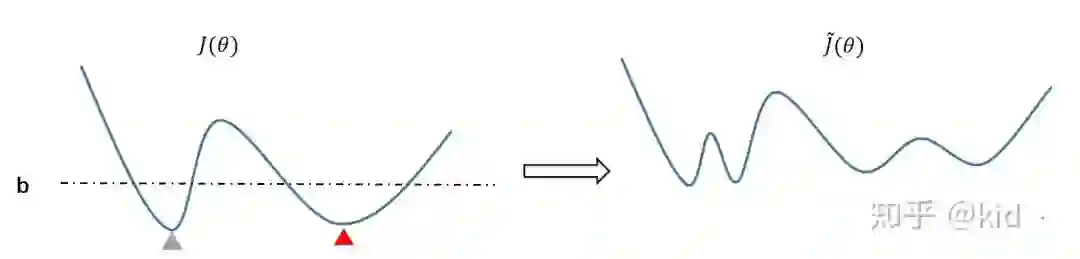 ,此时有两个极小值点(灰色三角形和红色三角形),首先试问哪一个极小值要好一些(这个后面再做分析)。另外,假设虚线代表