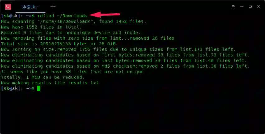 现在你将看到 /home/sk/Downloads/ 目录以及子目录中的重复文件。