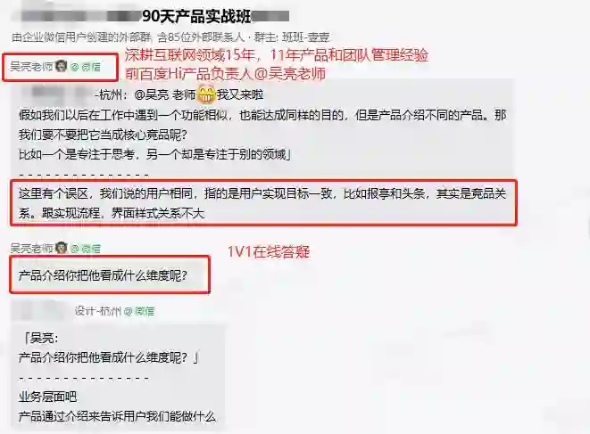 在学完产品的基础知识之后,我继续在班级群请教授课的老师们,老师们的方法论、过往经验都给了我很大的启发!