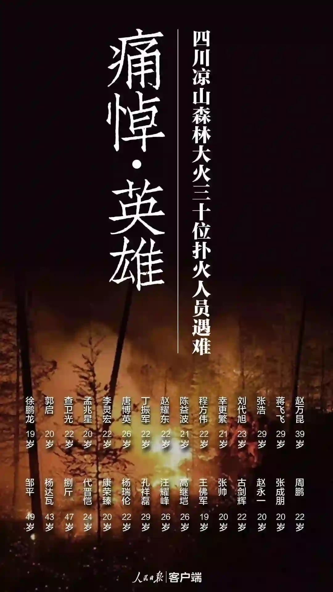 在这场牵动众人神经的天灾面前,无数勇士冲在了保卫人民群众生命安全和财产安全第一线。然而天地无情人有情,终有青春生命的陨落,在和死神的争夺中,三十个年轻生命将自己的青春永远融进了这片曾经浴火奋斗的土地。牺牲的27名森林消防支队的战士和3名地方干部群众中,共有2名70后,2名80后,24名90后,2名00后,年龄最小的19岁,分别是2000年3月出生的徐鹏龙和2000年7月出生的王佛军。