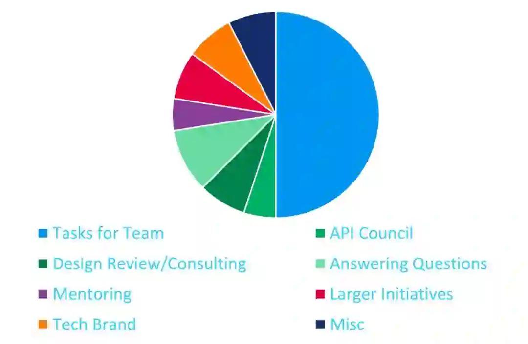 接下来的部分同样占据了相当比例的工作时间(大约 20%),这就是技术咨询(图表当中的绿色部分)。其中包括为各类设计方案——包括我自己的团队与其他团队提供咨询建议,回答技术问题以及在 API 标准委员会任职等。其中一部分与我的直接团队相关,但大多数是面向企业内的各个团队。有些问题还跟我个人有关,因为我虽然已经成为高级工程师,但当初入职时做的很多项目还在发挥作用,所以有时需要回答一些相关问题。随着所参与的项目数量不断增加,这方面工作内容也在持续增长。另外,虽然一直在回答问题,但我对于问题的考量方式与回答,或者说我提出的设计建议,也在随着时间推移而发生变化。
