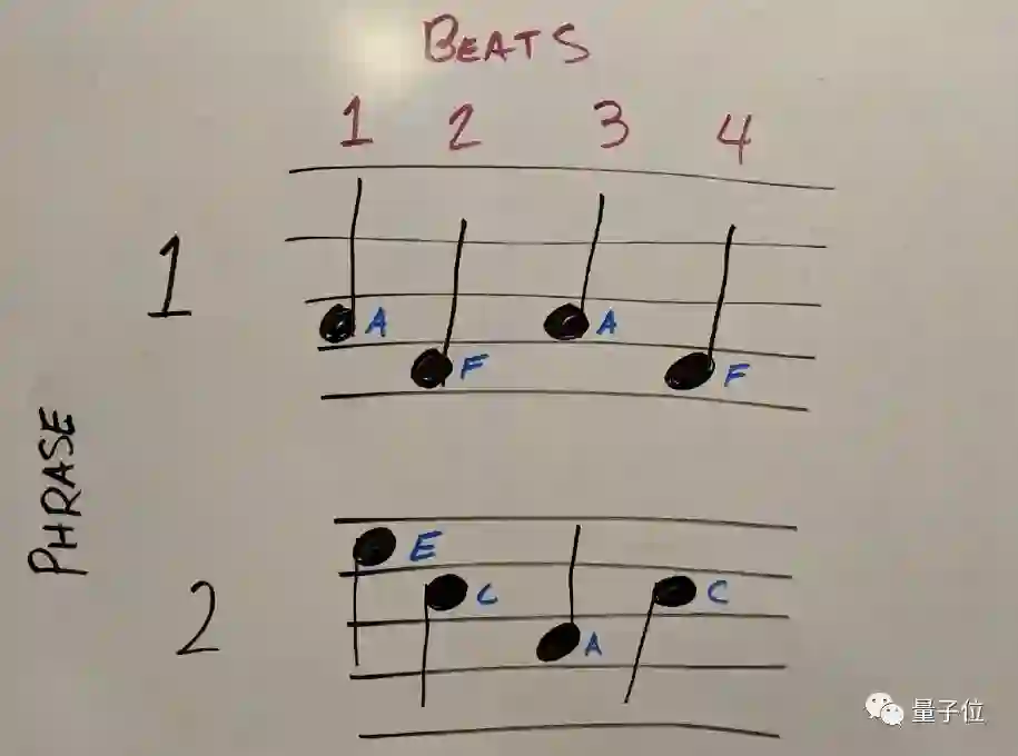 图中展示的是两个乐句,每个有4个节拍,每个音符旁边,是音符的名字,最上面是节拍。播放这些乐句的顺序,是从左到右依次进行。