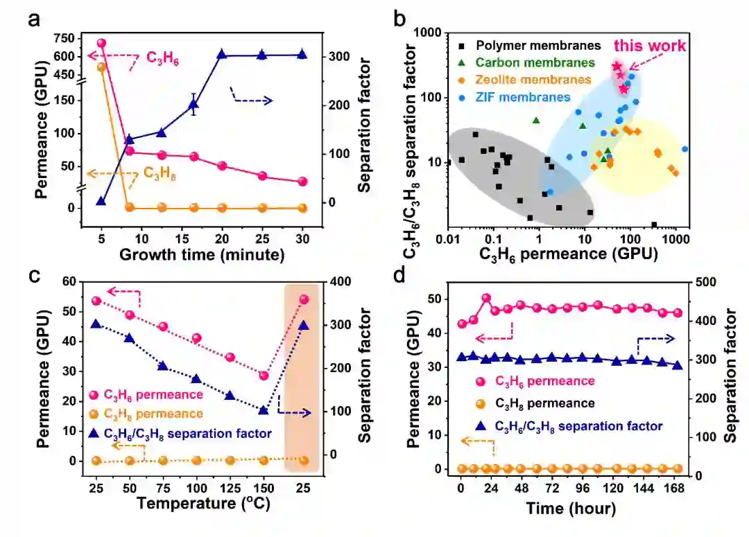 图3. a) 不同合成时间的ZIF-8膜的丙烯丙烷分离性能;b) 电合成的ZIF-8膜与文献中报道的其他膜的丙烯丙烷分离性能对比图;c) 合成时间为20分钟的ZIF-8膜的丙烯丙烷分离性能随着温度的变化图;d) 合成时间为20分钟的ZIF-8膜对丙烯丙烷分离的长期稳定性图。