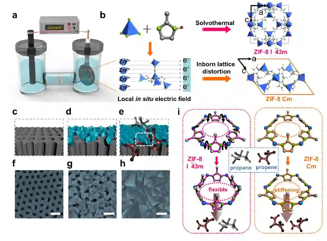图1. a) 电驱动合成ZIF-8膜装置示意图;b) 传统方法制备普通ZIF-8与电驱动制备刚性ZIF-8对比图;c-h) ZIF-8膜的缺陷自修复过程示意图;d) 刚性ZIF-8相在丙烯丙烷分离过程中的优势示意图。