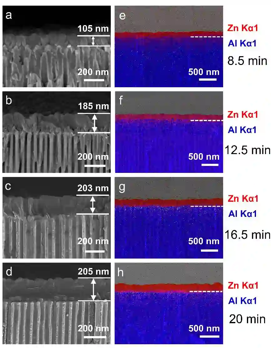 图2. 不同合成时间的ZIF=8膜的截面SEM和Mapping图。随着时间的延长,膜厚度增长趋于停止,表现出自抑制生长的特点。