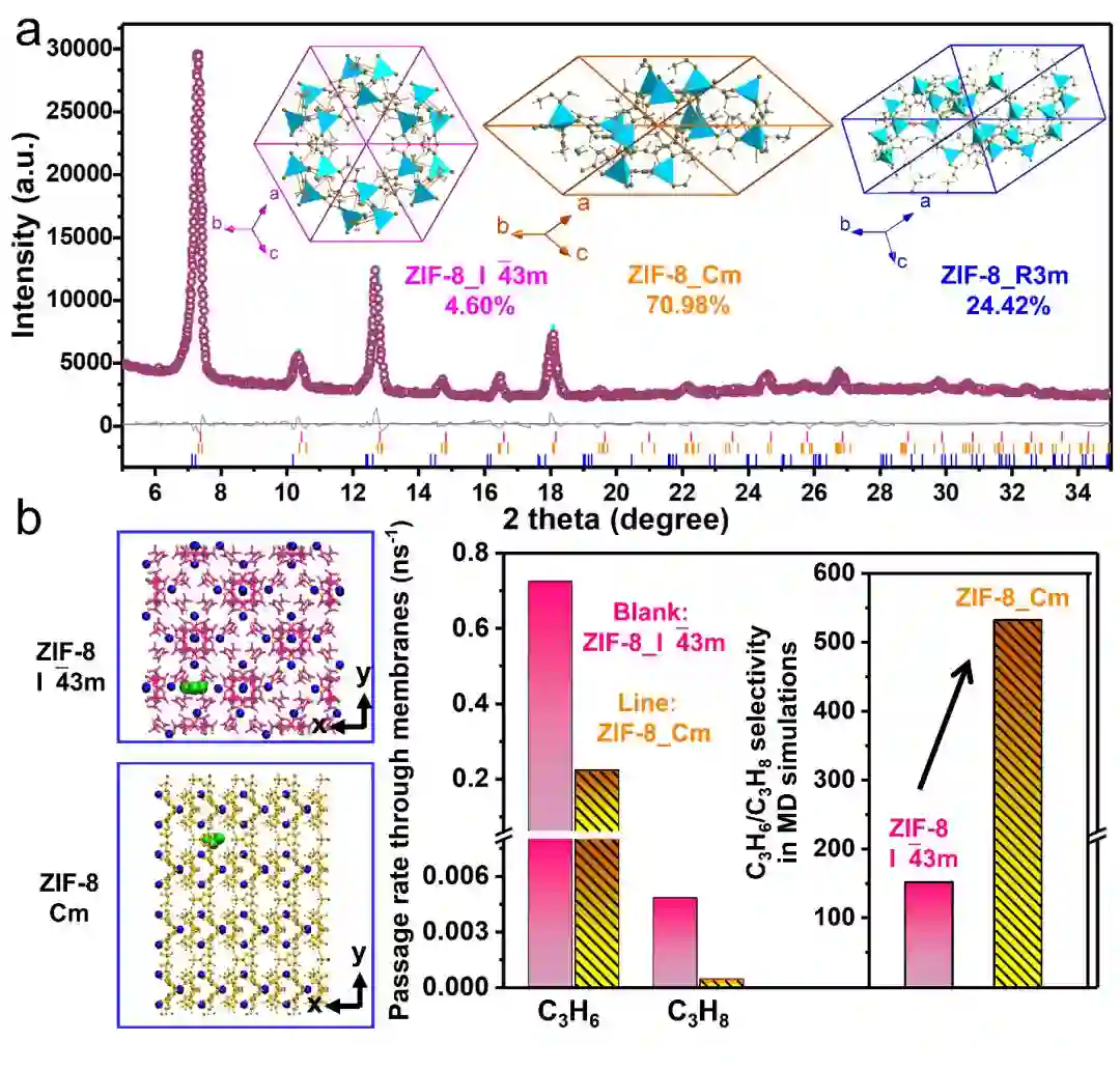 图4. a)合成时间为20分钟的ZIF-8膜的XRD精修结果图,其中膜的主要成分为偏刚性的ZIF-8_Cm相,而非柔性ZIF-8_I43m相;b) 刚性ZIF-8_Cm相膜和柔性ZIF-8_I43m相膜对丙烯丙烷分离的动力学模拟结果图。