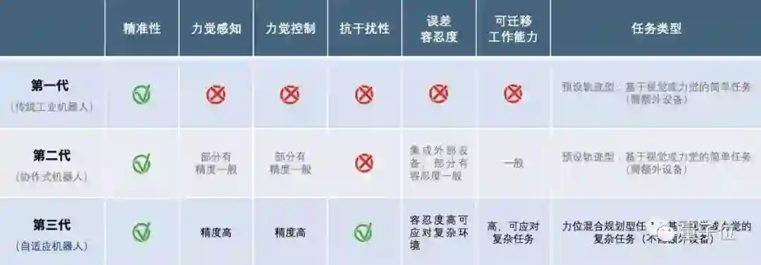 区别于一代高精度位置控制机械臂、二代协作式机械臂,第三代自适应机械臂有三大特点,让它与一代、二代机械臂有了革命性的差别: