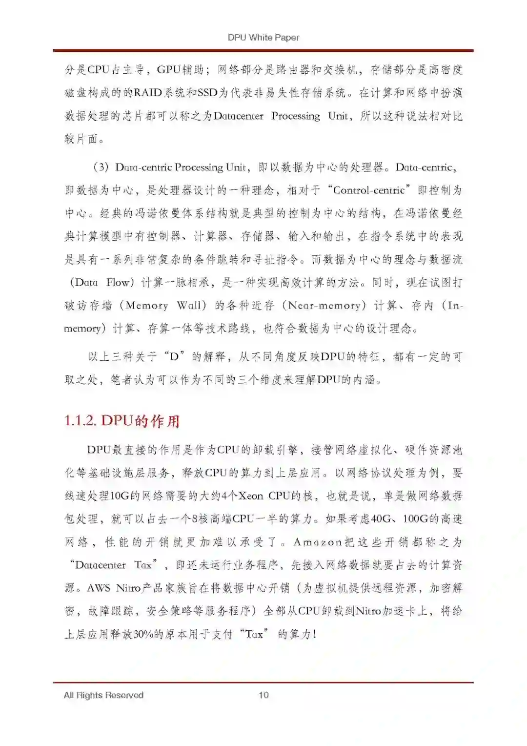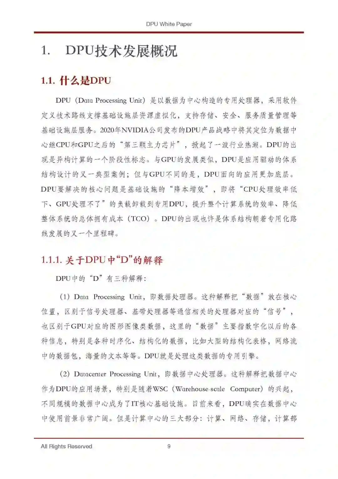 DPU(Data Processing Unit)是新近发展起来的一种专用处理器。2020年 NVIDIA公司发布的DPU产品战略中将其定位为数据中心继CPU和GPU之后的 “第三颗主力芯片”,掀起了一波行业热潮。DPU的出现是异构计算的一个阶 段性标志。与GPU的发展类似,DPU是应用驱动的体系结构设计的又一典型案 例;但与GPU不同的是,DPU面向的应用更加底层,类型也更多样。DPU要解 决的核心问题是基础设施的“降本增效”,即将“CPU处理效率低下、GPU处 理不了”的负载卸载到专用DPU,提升整个计算系统的效率、降低整体系统的 总体拥有成本(TCO)。新一代的DPU不仅可以作为运算的加速引擎,还具备 控制平面的功能,能够运行Hypervisor,更高效的完成网络虚拟化、IO虚拟化、 存储虚拟化等任务,彻底将CPU的算力释放给应用程序。DPU的出现也许是体 系结构朝着专用化路线发展的又一个里程碑。