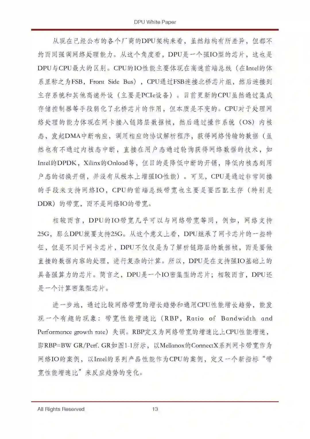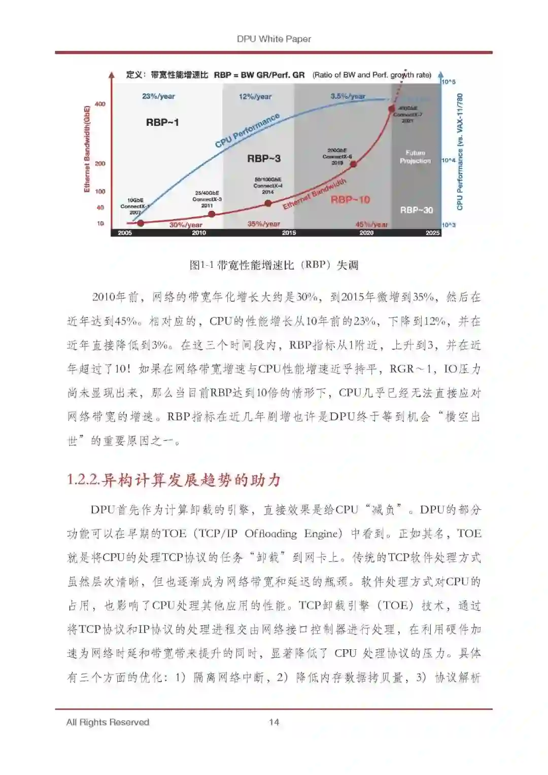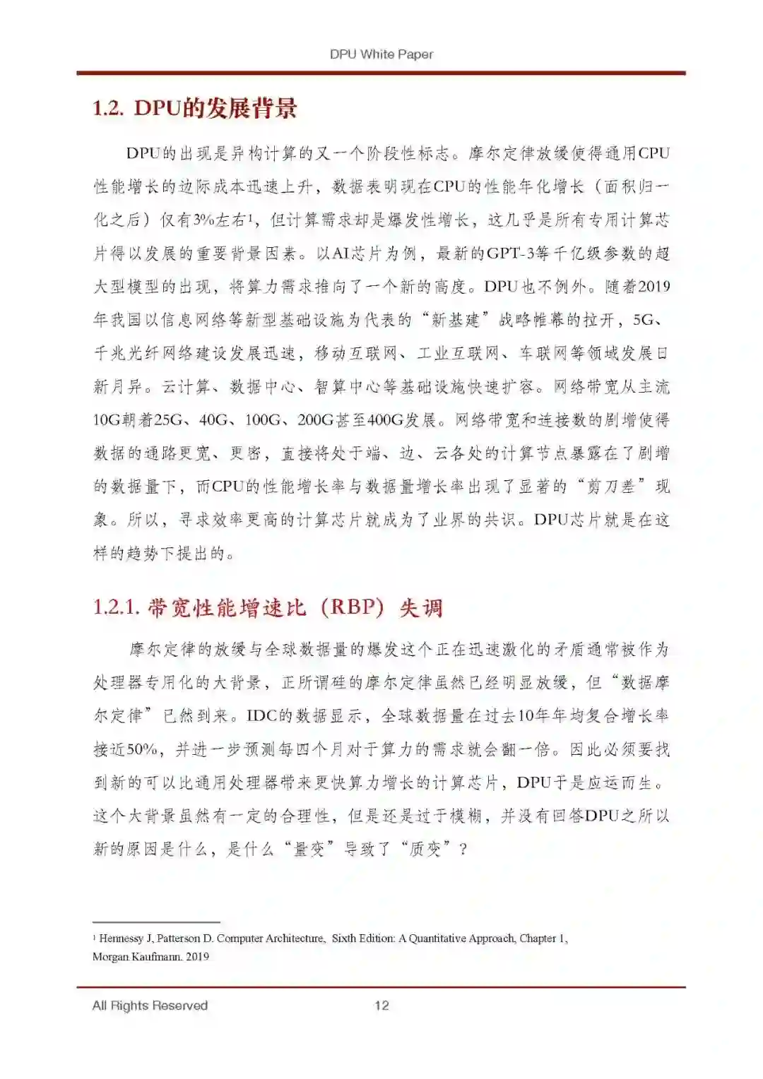 DPU的出现是异构计算的又一个阶段性标志。摩尔定律放缓使得通用CPU 性能增长的边际成本迅速上升,数据表明现在CPU的性能年化增长(面积归一 化之后)仅有3%左右1,但计算需求却是爆发性增长,这几乎是所有专用计算芯 片得以发展的重要背景因素。以AI芯片为例,最新的GPT-3等千亿级参数的超 大型模型的出现,将算力需求推向了一个新的高度。DPU也不例外。随着2019 年我国以信息网络等新型基础设施为代表的“新基建”战略帷幕的拉开,5G、 千兆光纤网络建设发展迅速,移动互联网、工业互联网、车联网等领域发展日 新月异。云计算、数据中心、智算中心等基础设施快速扩容。网络带宽从主流 10G朝着25G、40G、100G、200G甚至400G发展。网络带宽和连接数的剧增使得 数据的通路更宽、更密,直接将处于端、边、云各处的计算节点暴露在了剧增 的数据量下,而CPU的性能增长率与数据量增长率出现了显著的“剪刀差”现 象。所以,寻求效率更高的计算芯片就成为了业界的共识。DPU芯片就是在这 样的趋势下提出的。
