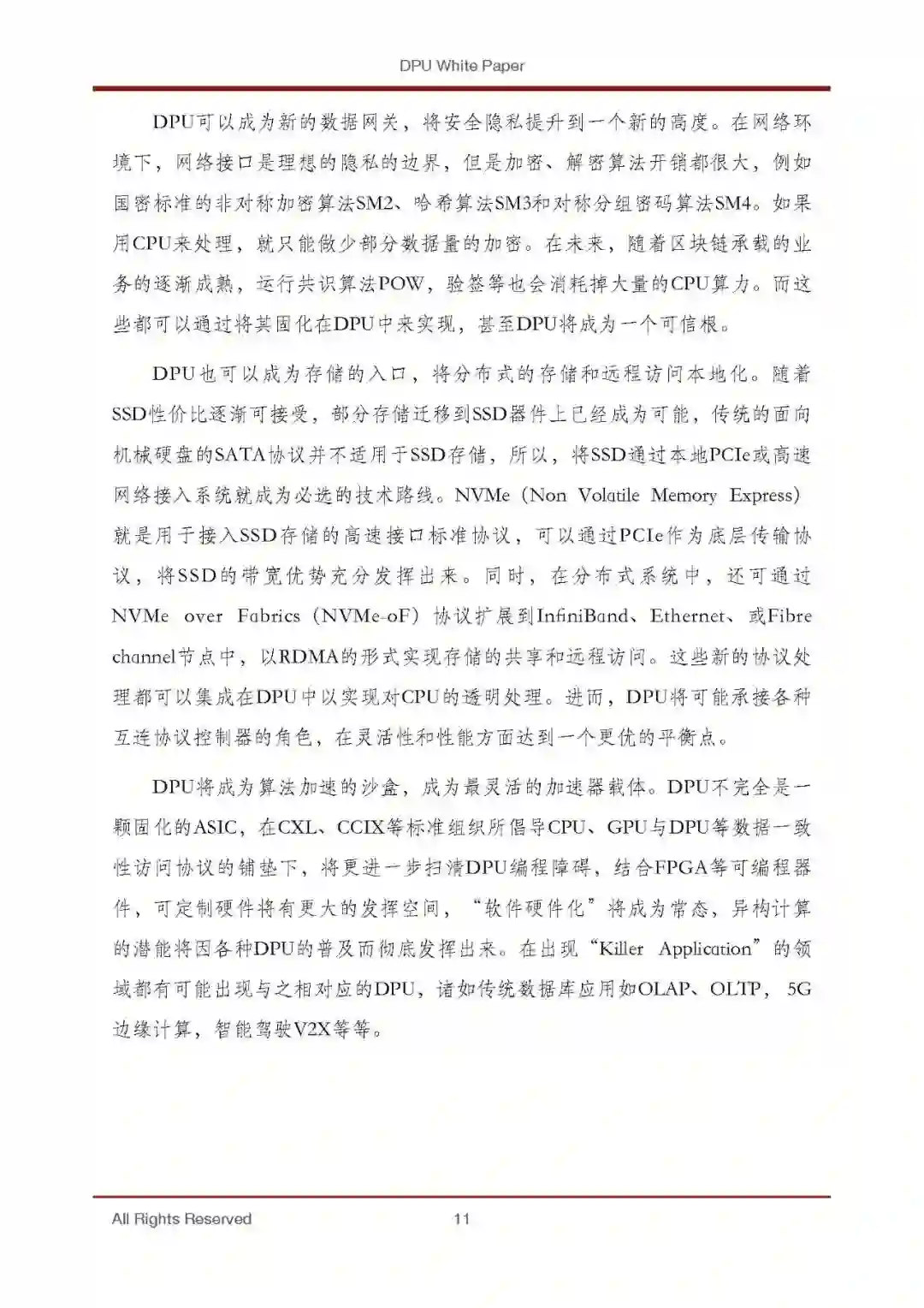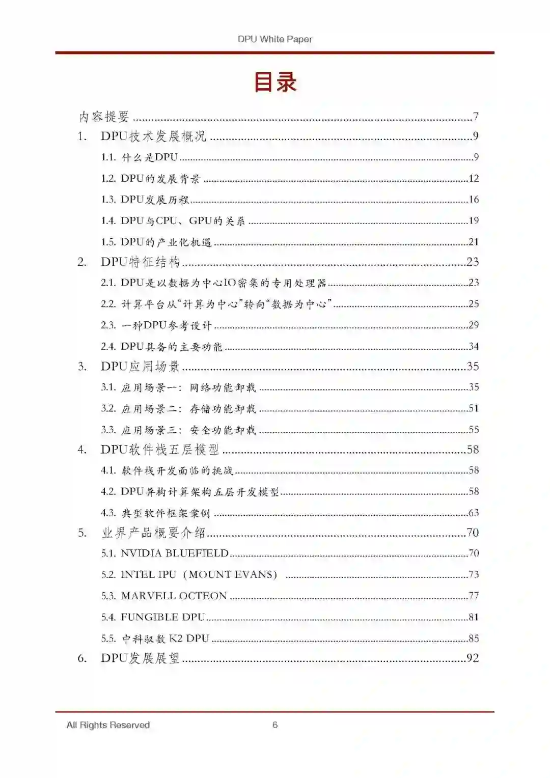 本白皮书将重点分析DPU产生的背景、技术特征、软硬件参考架构,应用 场景、并对目前已经公布的DPU产品做简要的比较分析,为后续DPU技术发展 提供必要的参考。本文的大体结构如下:第一部分介绍DPU的技术发展概况,首先对DPU做了一个基本的定义,然 后阐述了DPU发展的背景,并简要介绍DPU发展的历程,DPU在现有计算生态 中的角色,最后以DPU的产业化机遇作为总结。第二部分详细说明DPU的特征结构,对DPU的定位做了进一步阐述,然后 提出一种通用的DPU的结构模型。第三部分介绍DPU的应用场景,本文总结了三大应用场景:网络功能卸 载、存储功能卸载、安全功能卸载,这也是DPU目前最重要的三个应用方向。第四部分提出DPU开发的五层参考模型,包括设备层、操作层、计算引擎 层、应用服务层和业务开发层,既体现了DPU开发过程中的软硬协同,也充分 继承了通用软件栈的分层结构。第五部分概要介绍目前行业的已经发布或已经披露的DPU产品,虽然其中 绝大部分尚未到批量应用的阶段,各个竞品的优缺点也尚未得到市场的充分验 证,但是对于后续DPU研发具有重要的参考价值。第六部分展望未来DPU发展,并作为全文的总结。