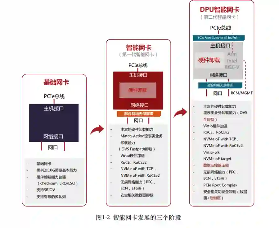 DPU发展历程 随着云平台虚拟化技术的发展,智能网卡的发展基本可以分为三个阶段 (如图1-2所示):