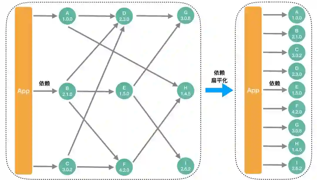 依赖扁平化的核心思想是事先把依赖项以及依赖版本号进行显示指定,这样通过固定依赖项以及依赖版本就彻底去掉了组件依赖计算的耗时,极大的提高了项目构建速度。与此同时,依赖扁平化还额外带来了下面的好处: