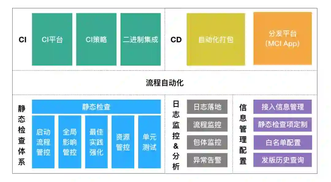 MCI架构体系包含移动CI平台、流程自动化建设、静态检查体系、日志监控&分析、信息管理配置,另外MCI还采取二进制集成等措施来提升MCI的构建速度。