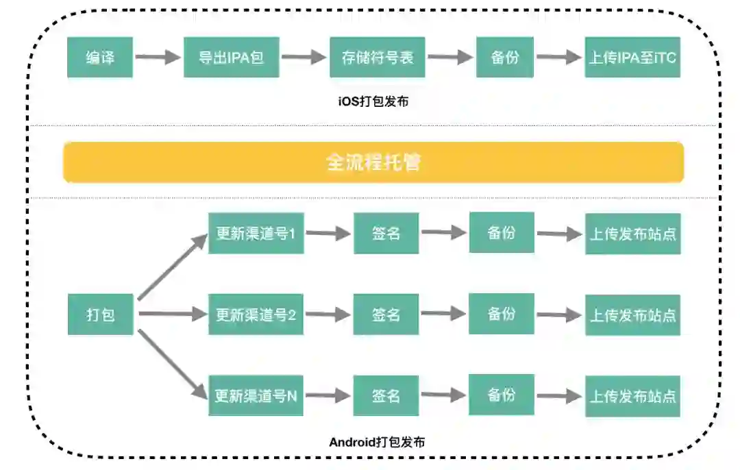 无论iOS还是Android,在发布App包到市场前都需要做一系列处理,例如iOS需要导出ipa包进行备份,保存符号表来解析线上Crash,以及上传ipa包到iTC(iTunes Connect);而Android除了包备份,保存Mapping文件解析线上Crash外,还要发布App包到不同的渠道,整个打包发布流程更加复杂繁琐。