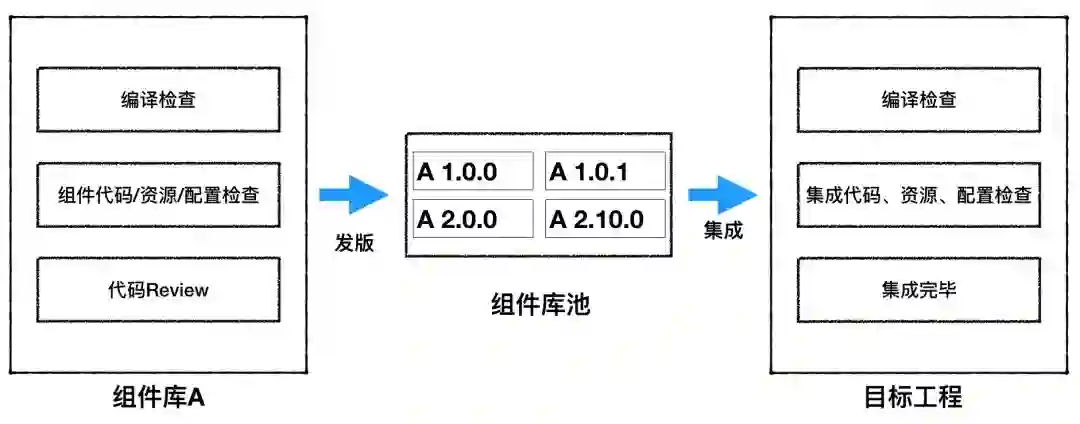 一次完整的组件集成流程包含两个阶段:组件库发版和向目标App工程集成。如下图所示: