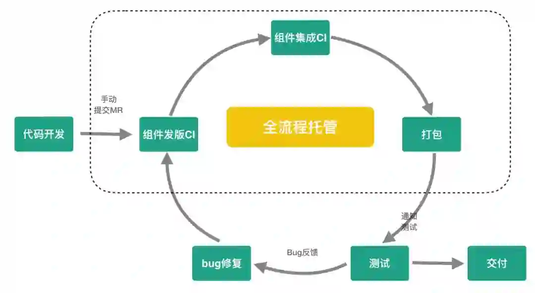移动研发要完成一个完整功能需求,除了代码开发以外,需要经历组件发版、组件集成、打包、测试。如果测试发现Bug需要进行修复,然后再次经历组件发版、组件集成、打包、测试,直到测试通过交付产品。研发同学在整个过程中需要手动提交MR、手动升级组件、手动触发打包以及人工实时监控流程的状态,如此研发会被频繁打断来跟踪处理过程的衔接,势必严重影响开发专注度,降低研发生产力。
