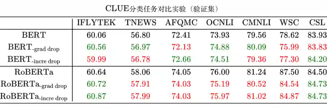 这里笔者在 CLUE 的几个任务上做了测试,结果如下表。其中,baseline 代码来自《bert4keras 在手,baseline 我有:CLUE 基准代码》,“grad drop”是对梯度进行 Dropout,“incre drop”是对更新量进行 Dropout,绿色表示相比 baseline 有提升,红色则表示下降。时间算力都有限,所有结果都只跑了一次,存在一定的随机波动。