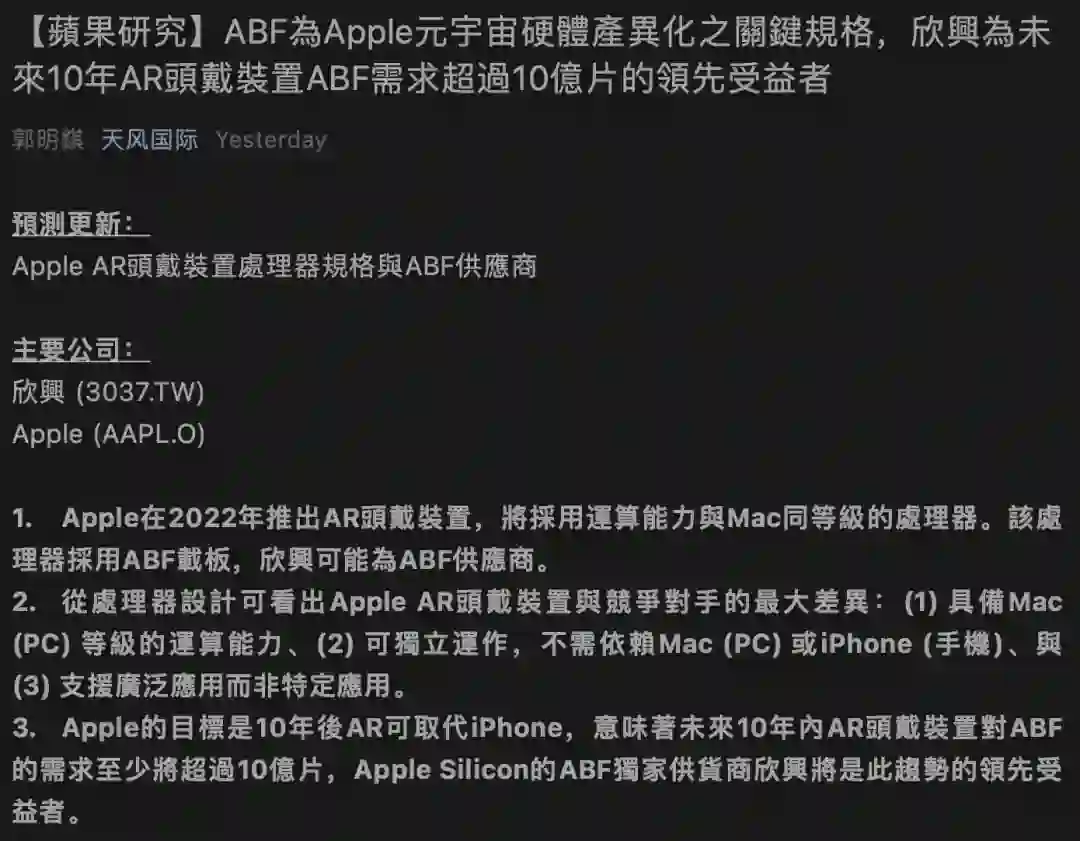 就在昨天,著名分析师郭明錤发表了对苹果AR的最新预测。