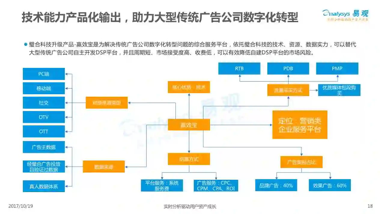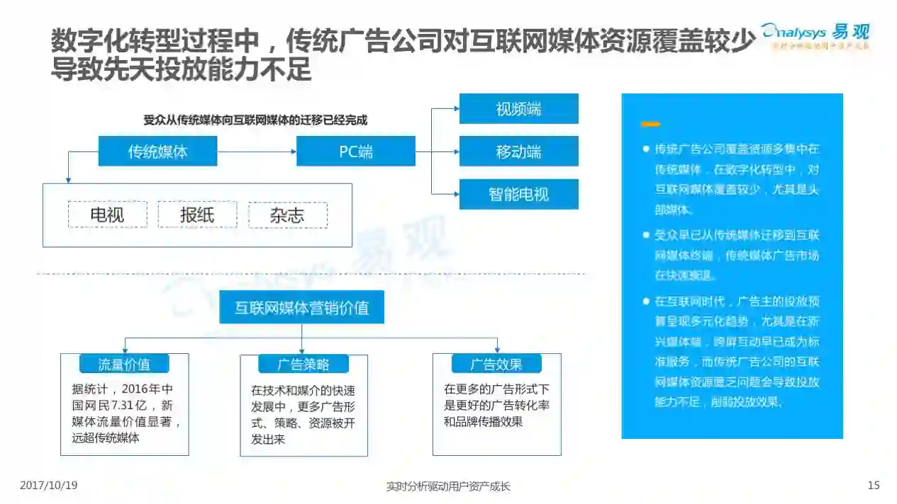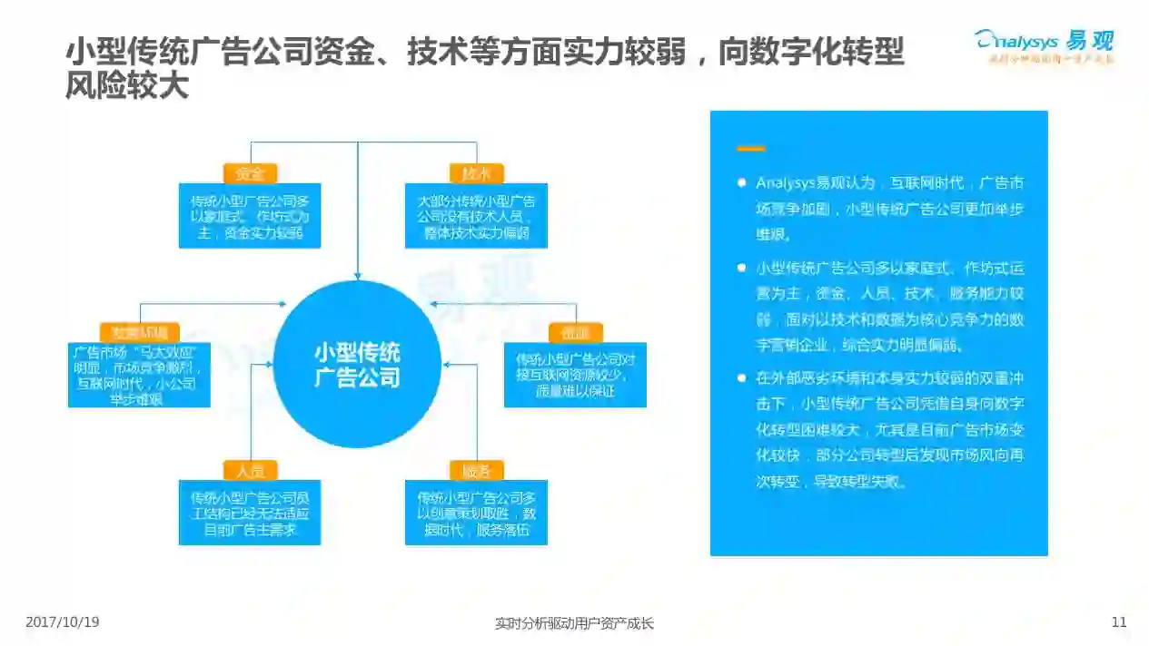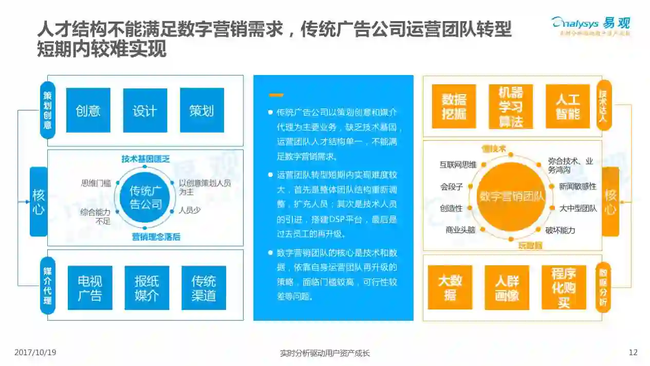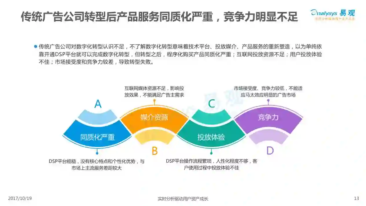 易观发布了《传统广告公司数字化转型白皮书2017》,分析认为在目前数字化高速发展的今天,传统广告公司需要加速拥抱程序化购买以实现数字化营销转型,分析对当前传统广告公司数字化转型现状和主要问题予以梳理,并以数字化转型服务商璧合科技为案例进行分析。