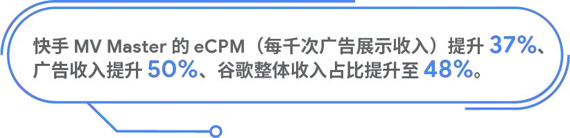 事实证明,通过这次和 AdMob 中介平台新产品——公开竞价(Open Bidding) 合作后,快手在广告变现上所获得的成绩也是格外突出:快手 MV Master 的 eCPM(每千次广告展示收入)提升37%、广告收入提升 50%、谷歌整体收入占比提升至 48% 1 (数据取样时间:2020.8.24-8.31)。