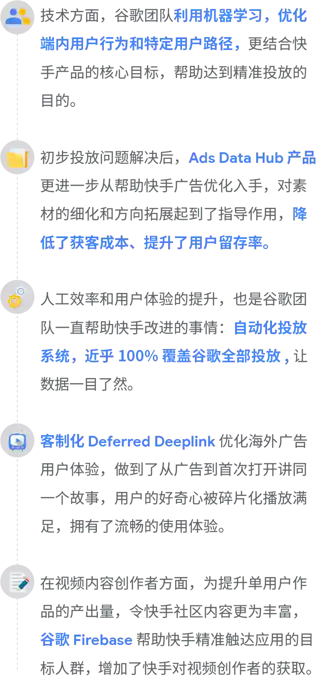 在快手进军新市场之前,谷歌首先利用自己的全球视角帮助快手布局海外,对不同国家的市场策略、特定节点进行了战略性分析,帮助快手预先了解当地消费者的行为习惯。同时确立业务增长点,绘制清晰的出海图像,而谷歌的专业也成为快手出海的“保心丸”,助快手在更多信息和策略的辅助下扬帆远航。
