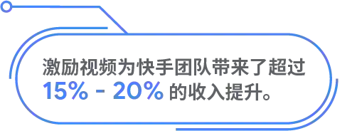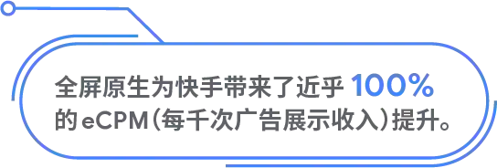 因为全屏原生广告本身可以与快手应用的短视频内容完美结合,所以与普通原生广告相比,全屏原生为快手带来了近乎 100% 的 eCPM(每千次广告展示收入)提升1,同时也为短视频应用里大量的上滑、下滑的用户使用场景提供了广告变现的机会。