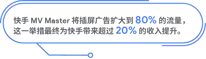一段时间后,快手惊喜地发现,插屏广告不仅没有给用户体验带来负面影响,而且广告单价是原生广告的 9 倍1。于是快手 MV Master 将插屏广告扩大到 80% 的流量,这一举措最终为快手带来超过 20% 1的收入提升,同时用户留存、商店评分等相关数据也没有下降。