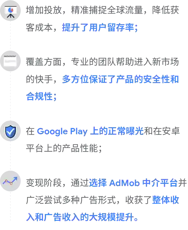 单枪匹马进军新市场,需要做好应对多种挑战的准备。快手巧妙借力拥有全球视角的谷歌,在谷歌助力之下克服投放、覆盖、变现等挑战,保证了应用出海生命全周期内的健康发展,并最终收获了海外广告收入提升 50%、广告变现提升 37%1 的成绩。