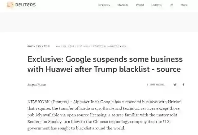 据路透社报道:“华为只能使用安卓系统的公共版本,但不能从谷歌获得专有应用程序和服务的访问。”