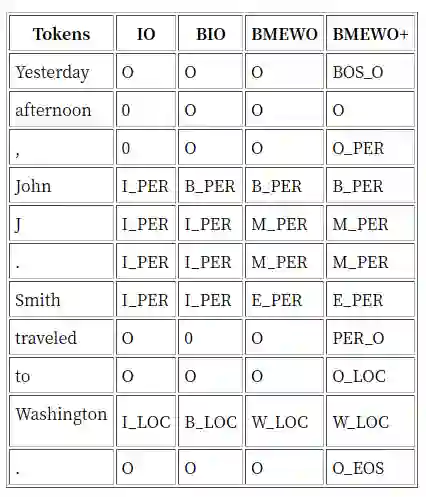 基于BIOES这个标注格式,衍生出了更加复杂的标注方法,明确了命名实体边界的边界,比如:BMEWO+(There is also BMEWO+, which put more information about surrounding word class to Outside tokens (thus "O plus"))这里给出一个图表以示区别: