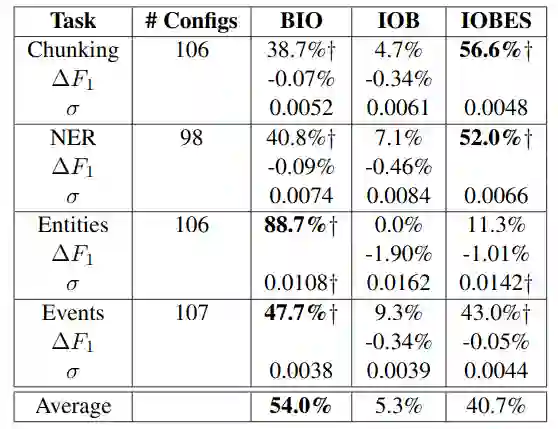 可以看到IOB表现很糟糕,BIO和BIOES各有优劣,网上也有一些小伙伴反馈说:BIO和BIOES在很多任务上的表现差异不大,可能是小数点后3-4位的差别。