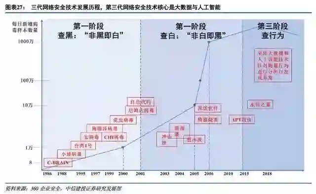 第二个阶段是2001年-2015年,第二代网络安全技术白名单机制,策略是“非白即黑”,这个时期互联网迅速普及,出现了能自我复制、自我传播的蠕虫病毒。