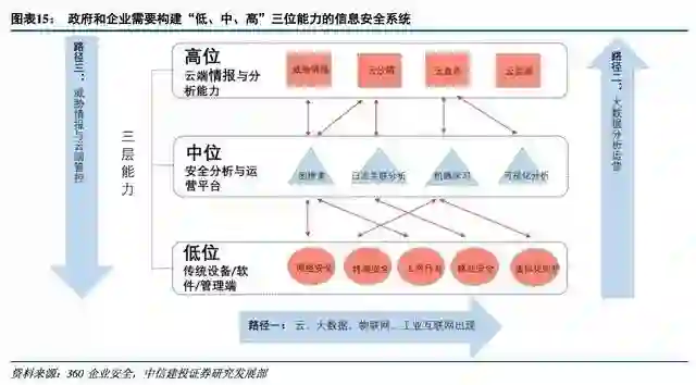 360企业安全曾提出,面对日益复杂的网络环境和层出不穷的网络攻击威胁,政府和企业需要构建“低、中、高”三位能力的信息安全系统。
