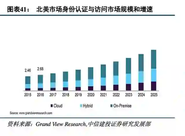 云计算、移动互联的快速发展导致传统内外网边界模糊,越来越无法基于物理边界构筑安全基础设施,因此企业安全的零信任模型是通过对人、终端和系统都进行识别、访问控制、跟踪实现全面的身份化,这样身份就成为了网络安全新的边界,以身份为中心的零信任安全成为了网络安全发展的必然趋势,2017年全球身份认证与访问市场达到88亿美金,并且将在2018~2020年保持13%的年复合增速。