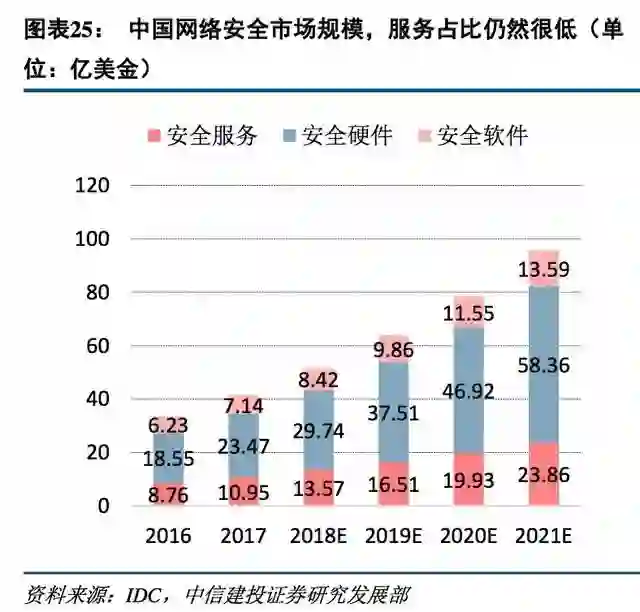 根据IDC统计2018年中国网络安全服务整体市场规模约为8.4亿美金,占网络安全服务总市场比例约为14%,相比美国安全服务市场占比达到30%还有较大差距。