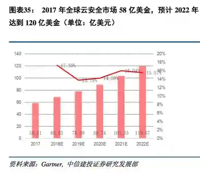 Gartner预测,2017年全球云安全市场规模达到58亿美金,同比增长21%,预计2020年全球云安全市场将达到90亿美金,年复合增长速15%,而中国云安全产品市场增长速度在2018年达到40%以上,增速显著高于全球。
