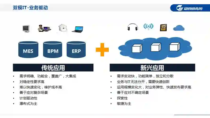 万华化学本身属于传统的制造业,其信息化建设正处于由传统应用向新兴应用转变的过程当中,传统的应用像ERP,MES,BPM等等在早些年的IT建设里面占据了非常大的比重。传统应用具有需求明确,功能全,覆盖面广,而且要有大集成的特点和能力,同时对稳定性的要求也特别高。但是传统应用,很多时候很难去快速响应企业业务需求的变化,维护成本特别高,在应对快速变化的复杂场景方面也有一些短板。随着云计算、大数据、容器、区块链,还有前面介绍过的云原生应用等新技术的发展,企业信息化需要越来越多的新兴应用去支撑,其特点就是需求变动快,功能简单、独立、分散。新兴应用往往业务和IT没有办法严格区分开,需要快速的响应和处理,而且运用规模变化大,对业务弹性、快速发布要求很高,相对于传统应用的瀑布式开发,新兴应用主要以敏捷开发为主。在这种企业信息化对新兴应用需求越来越迫切的情况下,在传统应用建设思路上做相应的转变和调整的背景下,万华化学提出了双模IT的建设思路。