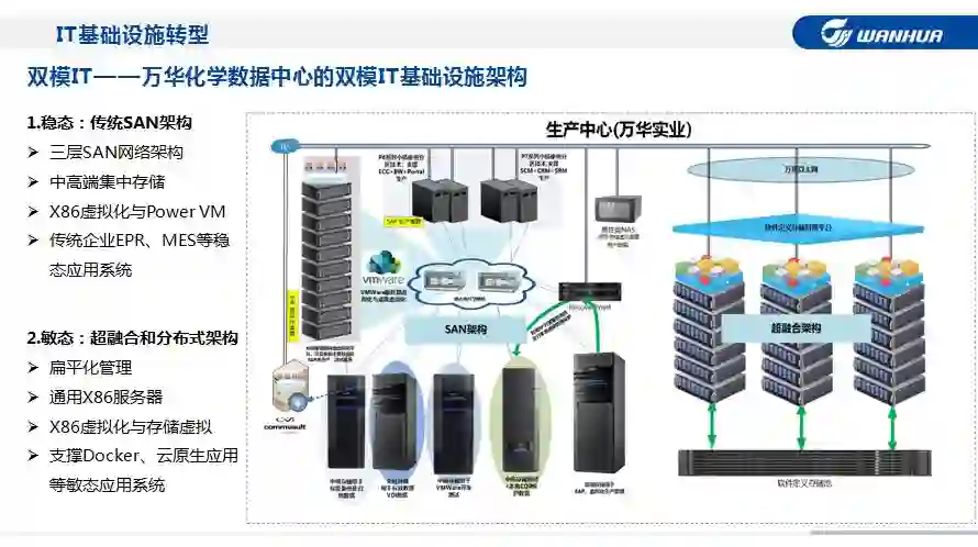 在信息化双模IT转型的背景下,万华化学IT基础设施针对性的做了转型和未来规划,这个转型主要是由传统的三层SAN网络架构到未来超融合的扁平化分布式架构的转变,是由传统企业ERP、MES等稳态应用系统向支撑Docker、云原生应用等敏态应用系统的转变。当然这个转变不是一蹴而就一下全部抛弃老设备,毕竟这些设备都是有生命周期的,转变需要一个过渡过程,但是方向是确定的。目前万华化学的超融合架构比传统的架构要简洁很多,非常清晰明了。