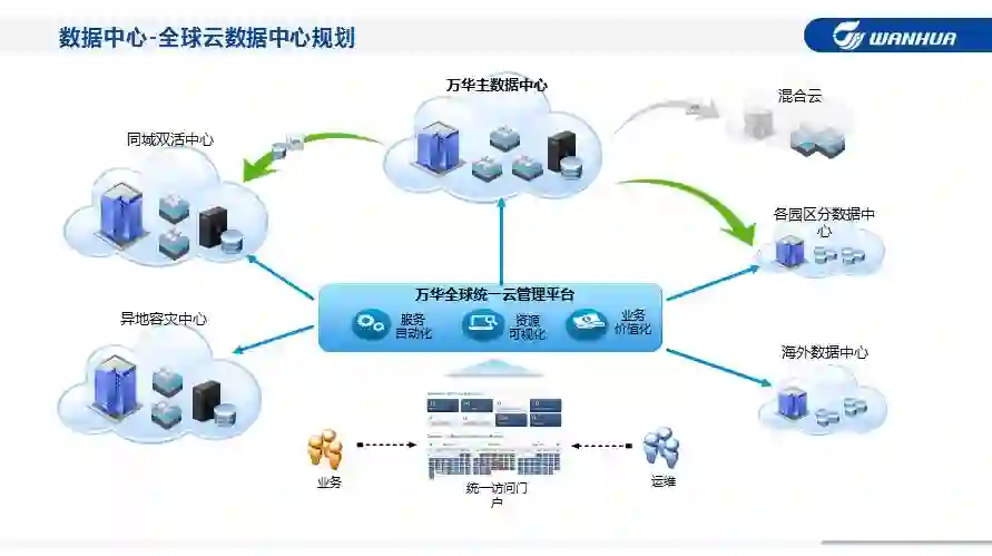 最后是万华化学全球云数据中心的整体规划和目标——万华化学全球云数据中心,实现万华全球统一的云管理平台,主要涵盖:万华主数据中心、各园区数据中心、海外数据中心、同城灾备/双活中心、各园区和海外分支机构的异地容灾中心等,将所有的IT资源全部统一管理起来,形成一个大的平台。最后实现IT高效、灵活的整体支撑。