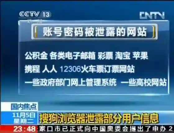 2013年11月,搜狗浏览器也曾被曝出泄露用户隐私一事,并因此吃到官司,被判赔付30万元。当时,央视等媒体曾曝光搜狗浏览器存在漏洞,导致部分用户账号密码等隐私信息泄露,央视记者亲自验证了搜狗浏览器漏洞的整个过程。据悉,这一安全事故涉及公积金、各类电子邮箱、彩票、淘宝、苹果携程、人人、12306火车票订票网站、一些政府部门网上管理系统,以及一些高校网站。