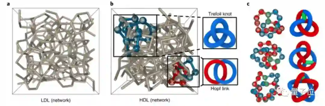 并且除了这些结和链,在高密度水网络还有很多打结的θ曲线,可以被视为两个纠缠的融合环(即共享至少两个顶点的环,图c)。