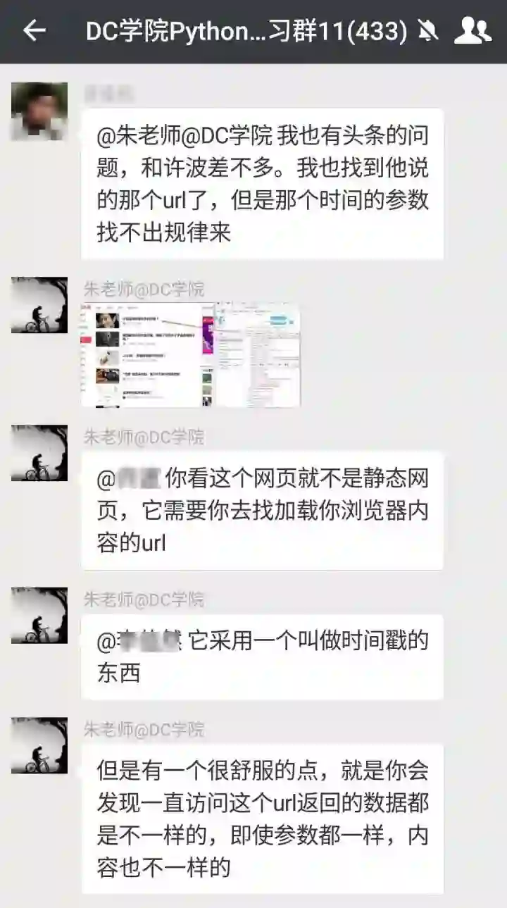 除了经验丰富、带你一步步实操的课程老师之外,DC学院还建立了提升效率的学习群,助教老师会在群里及时解答学员每一个疑问。同时,你还可以跟一群未来优秀的爬虫工程师,分享经验、代码、数据,探讨爬虫和数据分析技术。