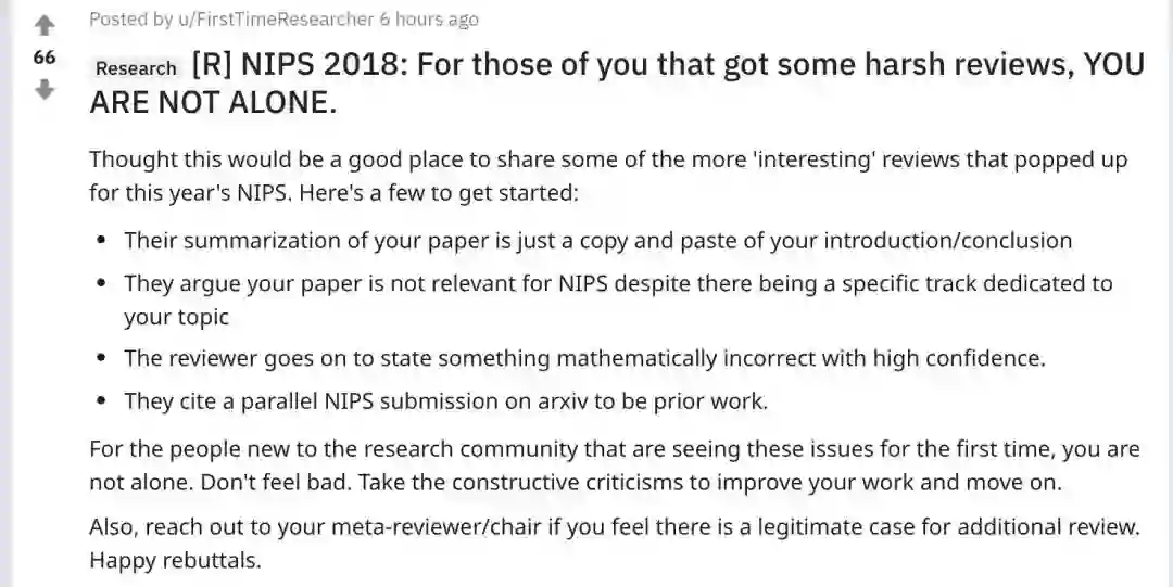 最后,正因为评审人员的标准降低,以及他们需要花更多的精力审议更多的论文,因此在评审结果出来后,很多研究者对论文的评分并不满意。在 Reddit 上很多讨论 NIPS 2018 评审结果的帖子可谓哀声一片。