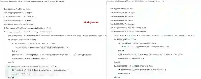 虽然这次宏利用样本后续是c#后门,不是MudddyWater常用的powershell后门,但根据其宏代码,以及诱饵文档内容等都与MuddyWater手法类似,且360威胁情报中心都披露了,那应该是没跑了。以下是一些与MuddyWater相似的代码