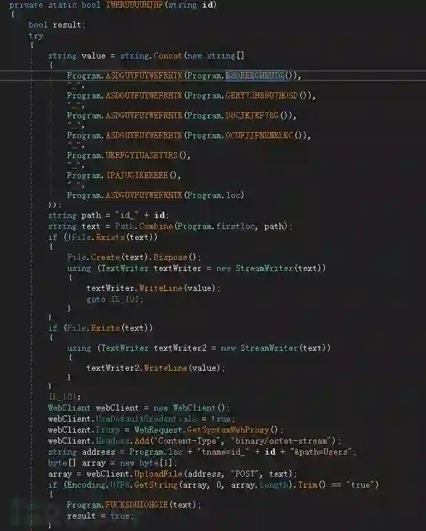 获取计算机id,用户名,ip等信息,base64加密后保存到%appdata%\Windows\Microsoft\FrameWork4\id_bW1fRDIyM0I1QjI"中,并将该文件上传到c2
