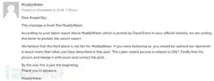 近年来,威胁情报越发的火爆,各类APT组织也陆续被国内外安全厂商披露,MuddyWater作为17年就被披露的组织,非但没有停止攻击,反而越发的动作频繁,从最初的针对中东地区,到现在的各个地区都出现了该组织的活动迹象,且该组织似乎异常高调,在卡巴斯基的年度报告下,muddywater似乎嫌卡巴将其排名放在后面,还在报告下评论,如下图所示