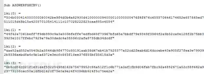 这儿笔者直接将宏拷贝出来,静态分析,由于样本无法进行调试,笔者只能猜测大概行为,看这个lki数组有大量数据,猜测是会执行该段数据。