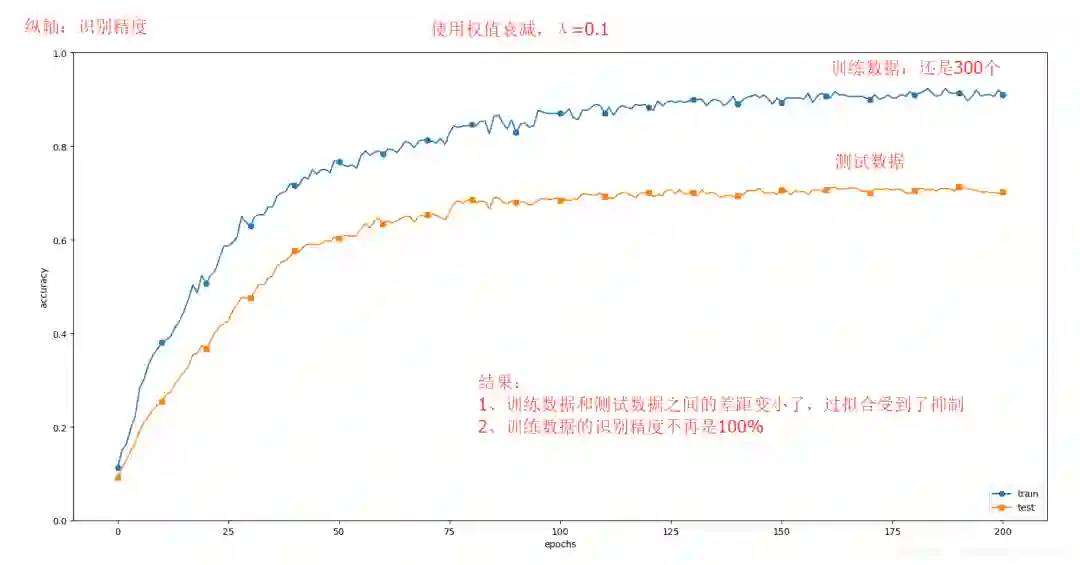 其实还可以通过改进其它超参数的值来抑制过拟合,而且能使网络的识别精度表现更好,继续看 <五、超参数的验证>
