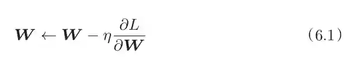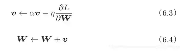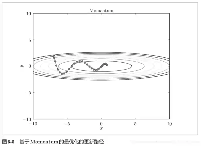 class Momentum:def __init__(self, lr=0.01, momentum=0.9): # momentum = α,设定为0.9self.lr = lrself.momentum = momentumself.v = None # 初始化时,v中什么都不保存# 第一次调用 update()时,v会以字典型变量的形式保存与参数结构相同的数据def update(self, params, grads):if self.v is None:self.v = {} # 变量v 保存物体的速度for key, val in params.items(): # params.items()为参数权重Wself.v[key] = np.zeros_like(val) # v会以字典的形式保存与参数W结构相同的数据for key in params.keys():self.v[key] = self.momentum*self.v[key] - self.lr*grads[key] # 式(6.3)params[key] += self.v[key] # 式(6.4) W = W + v