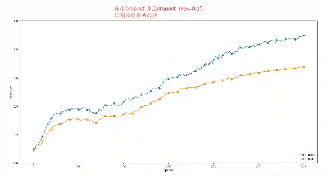 下图为使用Dropout的网络,虽然有效抑制了过拟合,但是识别精度不是很高,这还和别的超参数的设置有关;比如下图dropout_rate=0.2;我再把dropout_rate=0.15做了一次实验。可以看到识别精度有较大改善。(图二)